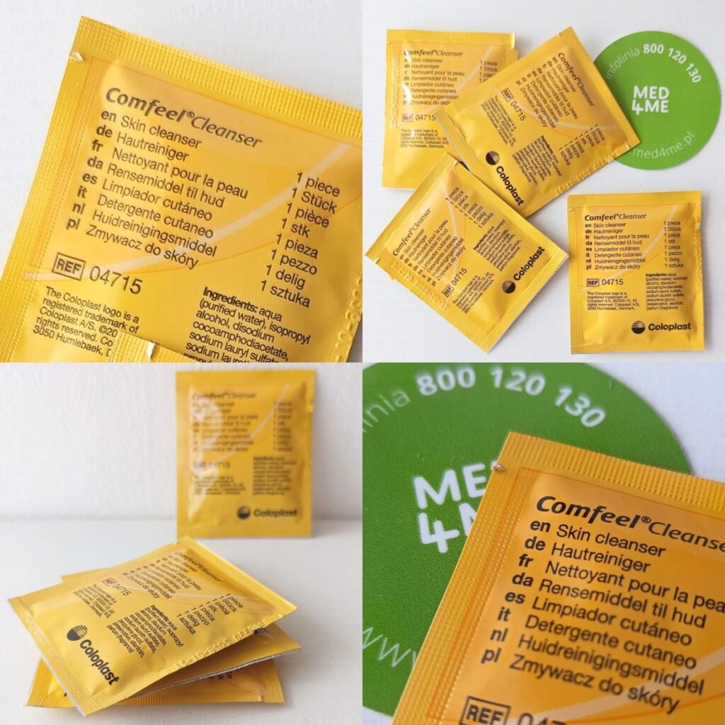 na zdjęciach CHUSTECZKI COMFEEL Cleaner marki Coloplast. Idealnie oczyszczają skórę z resztek kleju, treści jelitowej oraz moczu.
