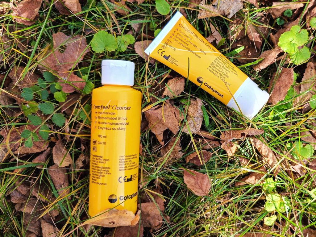 …choć można i w obrębie jednej marki. Tu: Coloplast: zmywacz do skóry i krem – bariera ochronna.