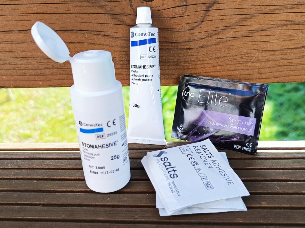 tu zdjęcie zestawu używanego na co dzień przez p. Asię (naszą zaprzyjaźnioną stomiczkę) Mamy tu; mix marek. Jest odklejacz Salts, chusteczki do oczyszczania skóry + spray bariera ochronna Trio, pierścienie hydrokoloidowe i półpierścien z aloesem Salts.