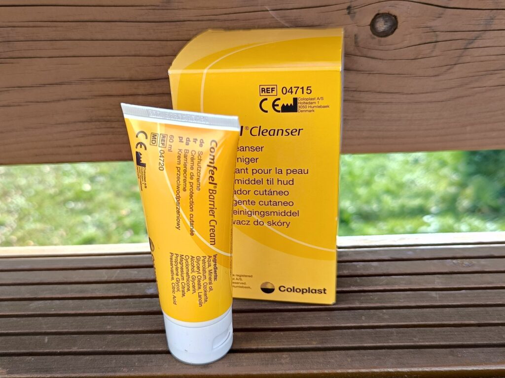 Coloplast płyn wspomagający odklejanie i krem przeciwodparzeniowy.