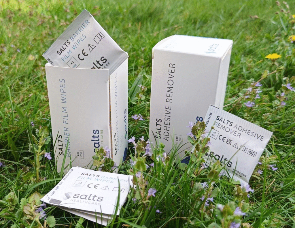 Salts chusteczki do oczyszczania skóry i te nasączone preparatem ochronnym. Te pierwsze czynią skórę wolną od treści jelitowej, resztek kleju i pasty stomijnej, podczas gdy drugie nakładają na nią ochronny film stanowiący wsparcie podczas przypadkowego kontaktu z treścią wydobywającą się ze stomii i podciekającej pod płytkę.