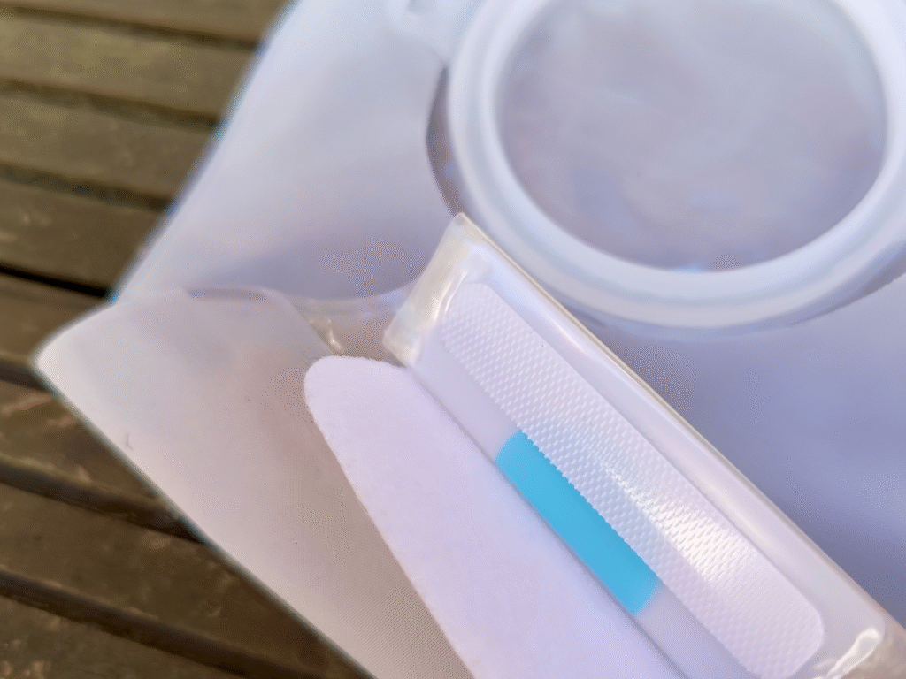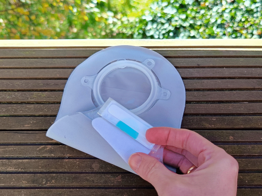 – Montaż: najpierw zakładasz płytkę zwykłą lub z funkcją FlowAssist. Upewniasz się, że przylega dobrze do skóry, a następnie dołączasz worek.