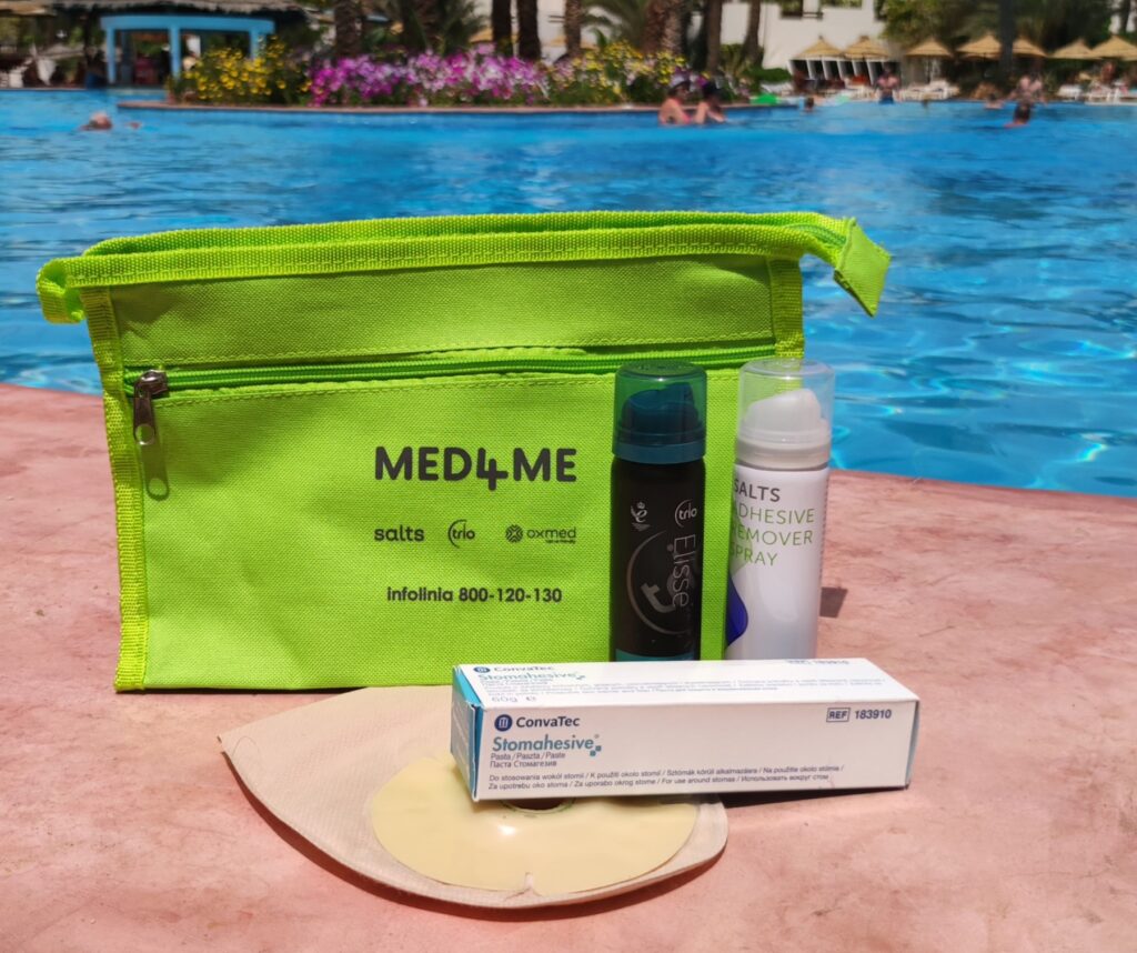 – zapasowy sprzęt – na każde wyjście, także na plażę, warto wziąć z sobą kosmetyczkę stomika, a w niej zapasowe 1-2 woreczki (z wyciętym otworem na stomię jeśli znasz swój rozmiar i wiesz, w jakich granicach się powiększa), oraz akcesoria stomijne umożliwiające higieniczną zmianę woreczka, nawet w trybie: awaria poza domem.