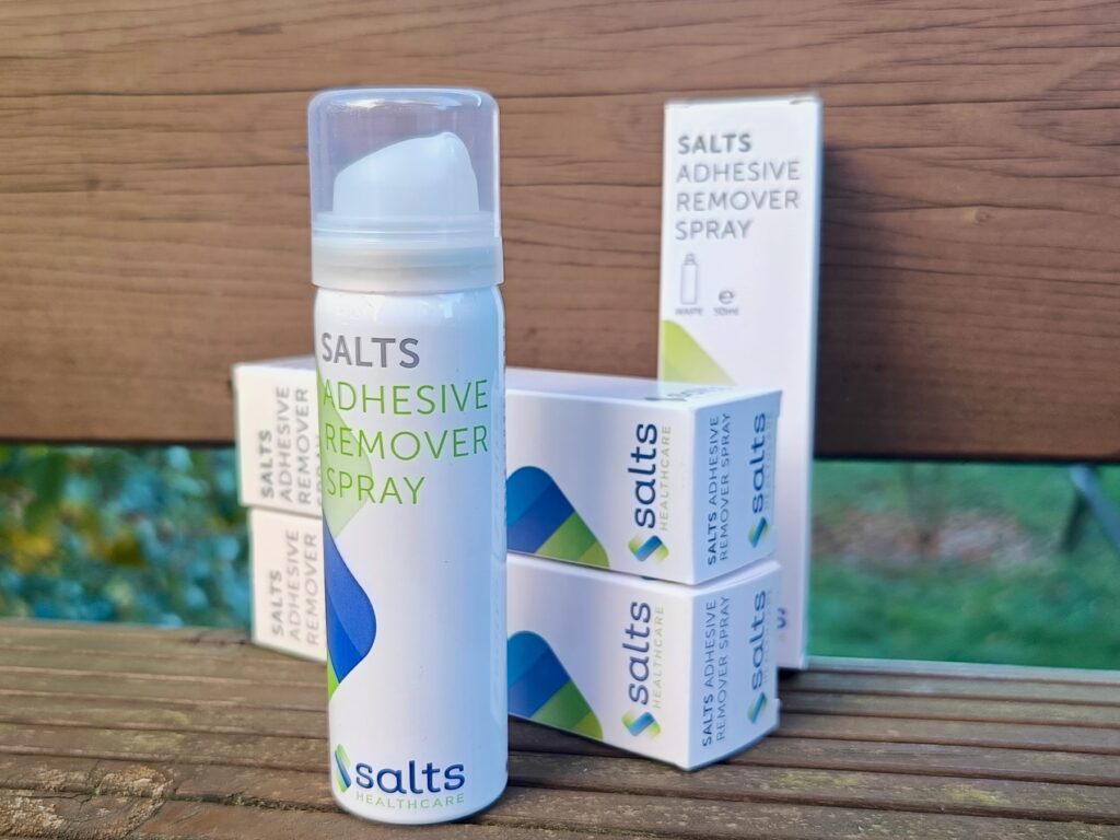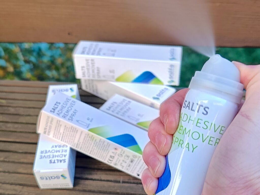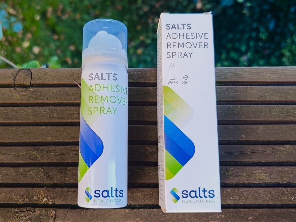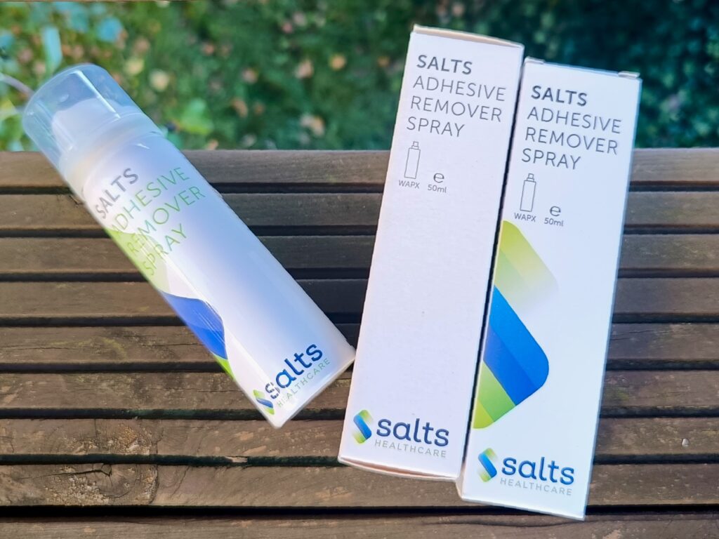 Remover Salts (pełna nazwa: Salts Adhesive Remover Spray) to delikatny środek ułatwiający odklejanie starej płytki oraz służący do usuwania resztek kleju i przylepca już po zdjęciu płytki lub worka stomijnego. Występuje w formie sprayu lub chusteczek dzięki czemu można go używać według własnych preferencji, zarówno w domu, jak i poza nim.