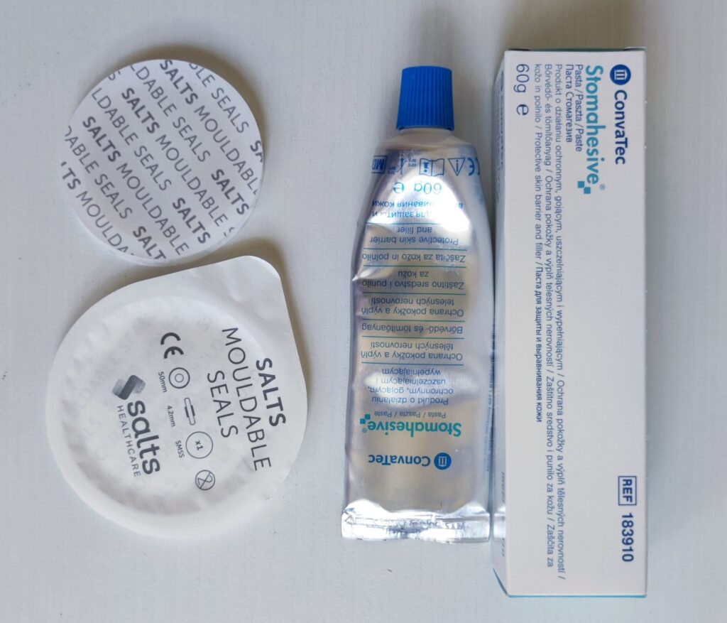 Pastę nakładamy wilgotnym palcem szczelnie wokół stomii. UWAGA! Nie próbuj tego robić suchymi palcami – zanim zdążysz nakleić pastę wokół stomii, wszystko inne przyklei się do Ciebie