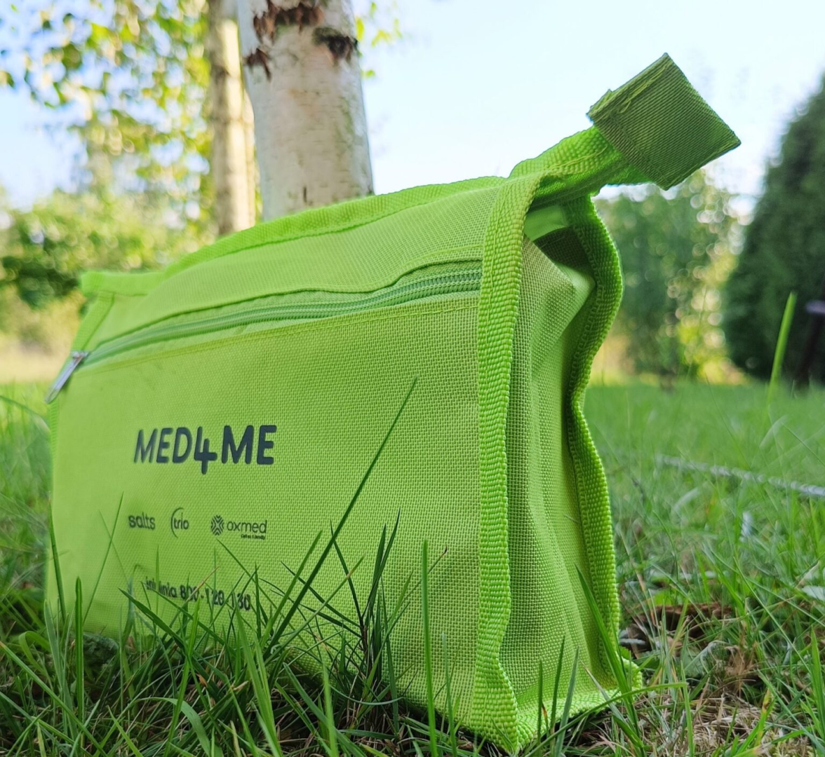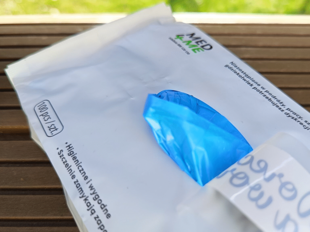 Szczelna, dyskretna może to być mały worek strunowy, lub zwykły foliowy woreczek jednorazowy. Nie zawsze znajdziemy kosz na odpady medyczne warto więc mieć rozwiązanie na tymczasowe przechowanie zużytego worka.